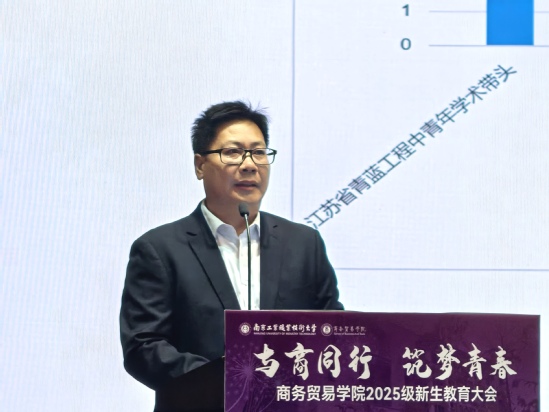 江苏苏豪国际集团股份有限公司党委书记、董事长徐雨祥在讲话中指出,南京工业职业技术大学作为全国首家公办职业本科试点院校,始终坚持“敬业乐群”校训,践行职教报国初心。江苏苏豪国际集团作为江苏省属企业,正从传统外贸企业向数字化、品牌化、专业化的综合型贸易集团转型,其发展轨迹与南工精神高度契合。近年来,江苏苏豪国际集团股份有限公司与学校共建“苏豪产业学院”,共同打造“三平台聚力'三性'人才培养”模式,取得了显著成效。徐书记表示,校企合作重点推进的“苏豪精英班”升级计划、“双导师制职业领航工程”、服务“一带一路”建设三大项目,已构建起“人才共育、技术共研、成果共享”的生态体系。通过举办“苏豪杯”外贸技能大赛等实践活动,商贸学子展现出将竞赛方案转化为实战项目的卓越能力,这正是企业迈向世界一流所需的核心力量。苏豪集团今后将为“苏豪精英班”同学提供每年8万元的奖助学金,奖励优秀的同学并资助困难学生。最后,徐书记表示职业教育前途广阔、大有可为,并为新生送上真挚寄语:一是希望同学们牢记“敬业乐群”校训。践行“双手万能”的理念,夯实专业技能,用专业书写未来;二是希望同学们珍惜大学时光。勤奋学习,刻苦钻研,不负青春韶华;三是希望同学们厚植家国情怀。将个人理想融入国家发展大局,在民族复兴的伟大征程上,书写属于南工学子的报国篇章。
