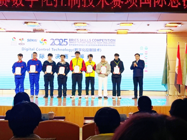 12月13日至16日,2025金砖国家职业技能大赛“数字化控制技术”赛项国际总决赛在济宁职业技术学院圆满举行。大赛汇聚了来自金砖国家及地区的40余支精英队伍同台竞技。我校电气工程学院代表队表现出色,凭借扎实的专业技能与稳定的现场发挥,在激烈角逐中脱颖而出,一举斩获国际总决赛一等奖。
