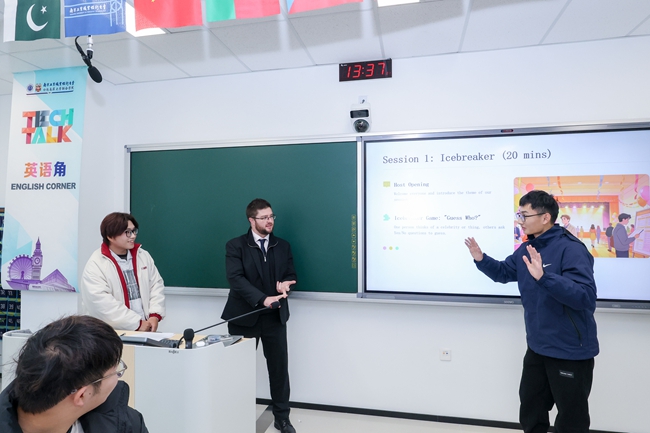 本次英语角延续“Tech & Talk”系列特色,通过结构化环节设计,引导学生从个人感悟切入,逐步深入话题内核。活动设置三个环节:开场破冰游戏迅速活跃现场气氛;随后,同学们依次分享自己钟爱的电影或书籍,并以小组合作形式创意融合不同作品元素,构思全新故事脚本;在深度研讨环节,外教通过多层次问题引导学生交流,大家的思考由角色解读延伸至现实观察,在互动中切实提升了语言组织能力与多元思辨能力。
