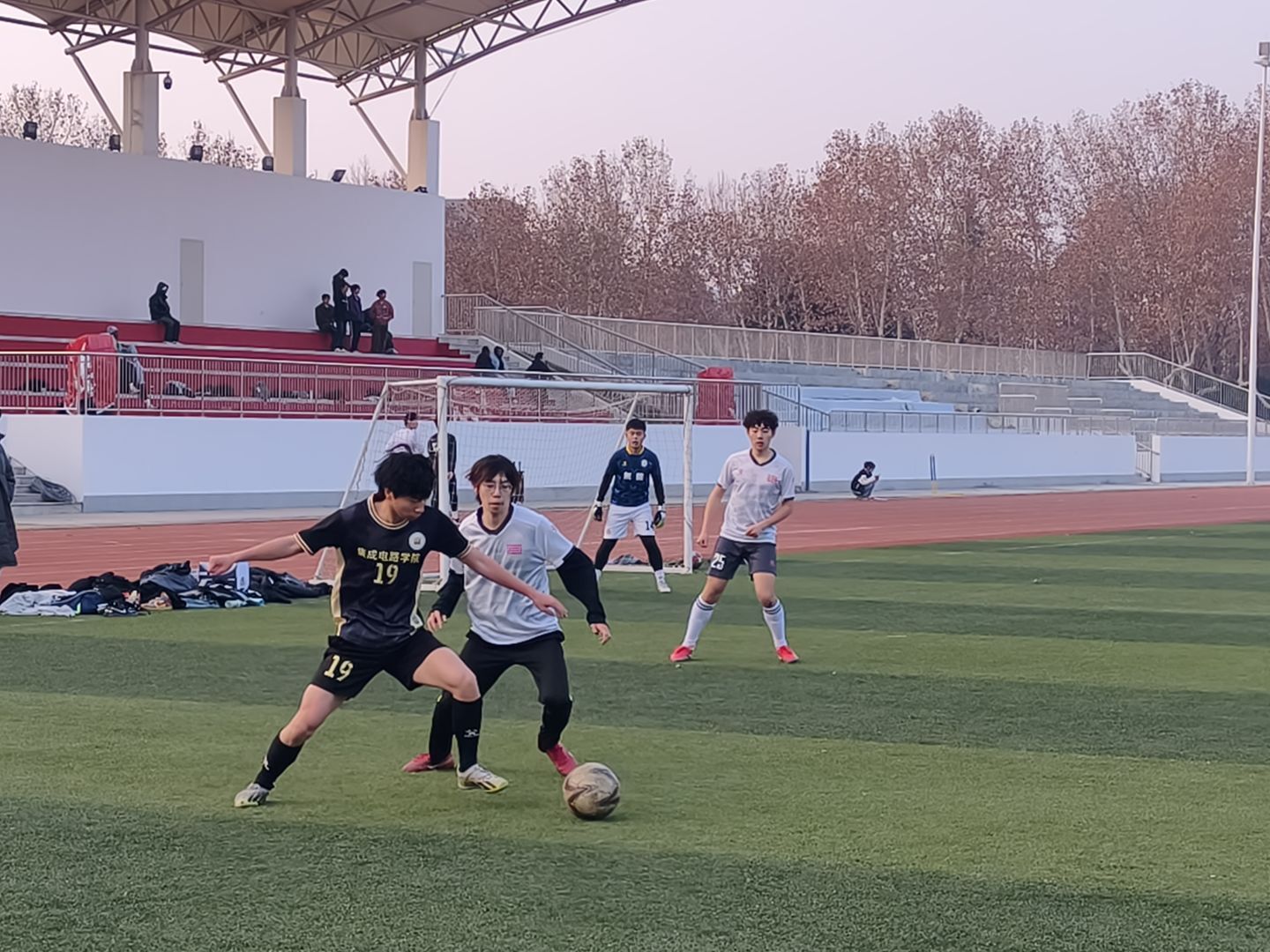 12月17日,我校2025年“新生杯”足球比赛在学校体育场顺利收官。校团委副书记蔡骁,国际教育学院直属党支部副书记、副院长张莉,科技园管理有限公司副总经理张威,体育部副部长金超及教师足球队队长张巍到场观战并为球员们颁奖。其中,张威、金超和张巍参与比赛并与同学们同场竞技。
