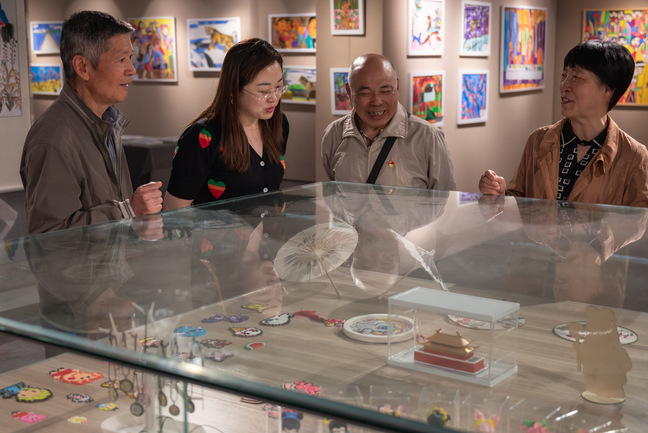 南京首届星宝艺术展呈展了来自南京市12个区特殊教育学校学生创作的包括国画、油画、板画、文创、手工艺品等共500余项作品。陈桂林一行在星宝们的艺术作品前驻足观看,他对星宝们高水平的艺术展现力给予赞赏,对艺术设计学院成立南工艺康爱心服务队并为星宝们举办画展,让社会各界了解他们、关爱他们、支持他们的举措给予高度认可。孙静松详细介绍了参展星宝们的成长经历,讲述了孤独症儿童如何用绘画的方式与这个世界建立连接,用绘画表达自己的内心世界的点点滴滴。