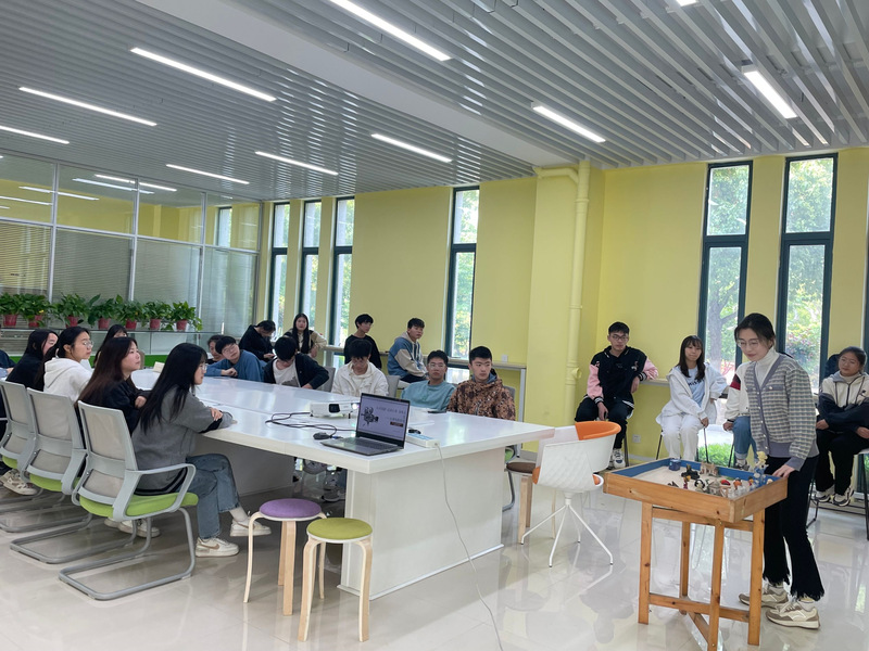 首先是热身和破冰环节,周蕾邀请同学们每人选择一个自己喜欢的沙具并摆放在沙盘中,以“姓名+班级+选某个沙具的原因”的方式进行了别开生面的自我介绍,营造了轻松的氛围。