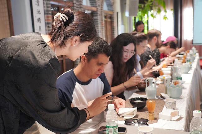 借着大家对“茶圣”陆羽和茶文化的好奇与探究,本次品鉴体验活动的特邀嘉宾——江苏省茶文化学会副秘书长、首席培训师、非遗宋代点茶传承人徐萍老师,在处处流淌着古风雅韵的茶肆,用一壶醇和清甜的老白茶为留学生们开启了一场精雅的宋式点茶体验之旅。她围绕“宋人雅事、宋茶之美、宋茶之于生活”,将宋代人的生活方式、宋代茶文化特点、点茶的发展历史等内容娓娓道来。在文化熏陶铺垫后,徐萍耐心细致地为留学生们讲解并示范选茶、碾茶、温盏、注汤、击拂到点茶的步骤和要领。演练过程中,老师娴熟的手法和技巧体现出不一般的“中国功夫”,叫人赏心悦目。随后,留学生们在老师的指导下,快速抖动手腕,将茶盏中的茶汤击出沫饽,一股浓郁的茶香随之溢散开来。成功击拂后,每位同学还挑战了升级技巧,用茶匙以绿色茶膏在白色沫饽上即兴创作,或文字、或图案,每个DIY作品都风格鲜明、各显其美,大家纷纷用手机将自己的“点茶首秀”定格。