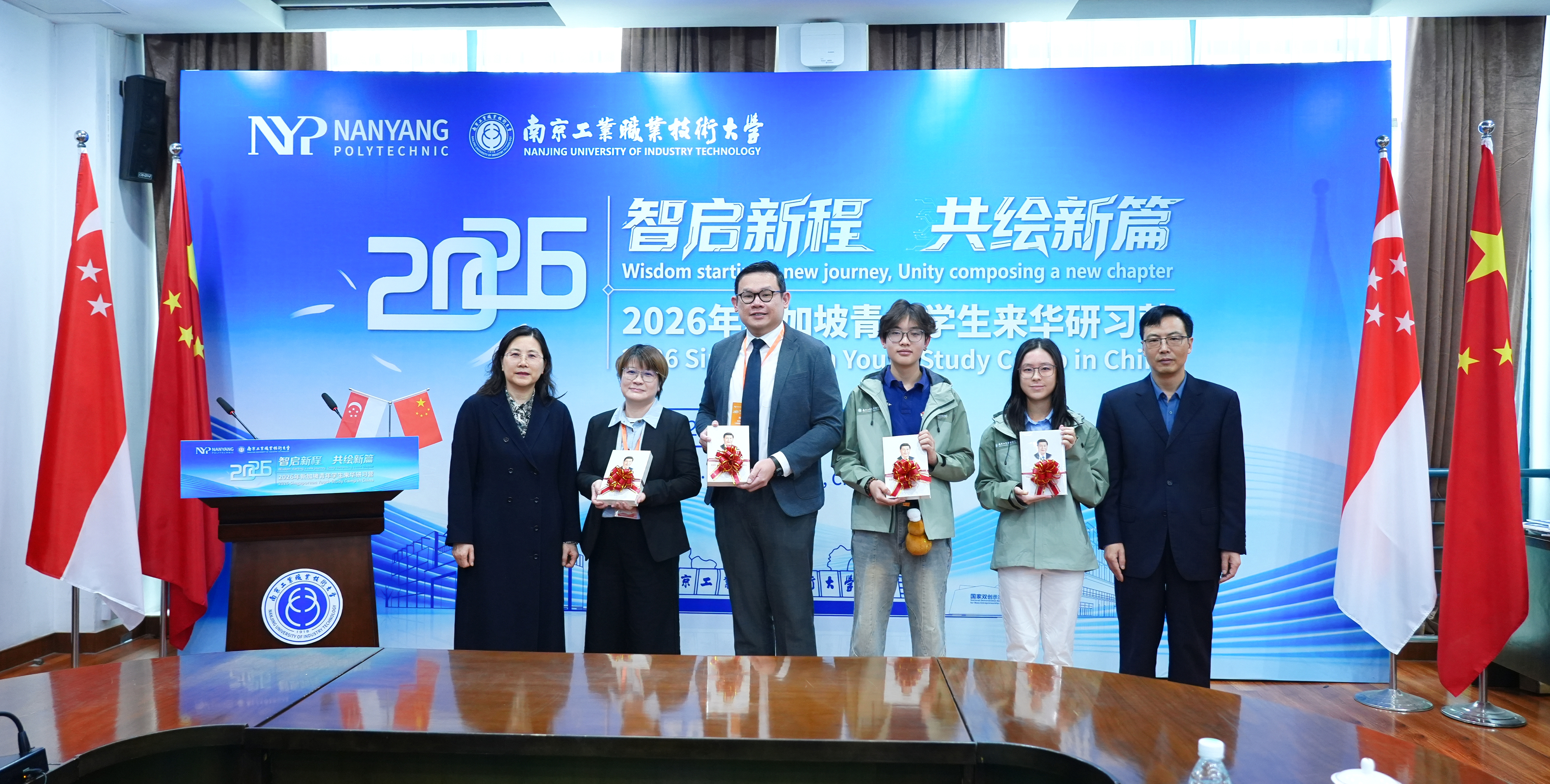 开营仪式上还举行了赠书仪式和授旗仪式,魏萍向研习营学生代表刘玮安(Brendan Lau )授营旗,与我校经济管理学院党委书记殷红卫共同向新加坡教师和学员代表赠送书籍。新加坡南洋理工学院来华研习营领队老师何国荣(Lawrence Ho)及我校国际合作与交流处、经济管理学院相关同志参加了开营仪式。