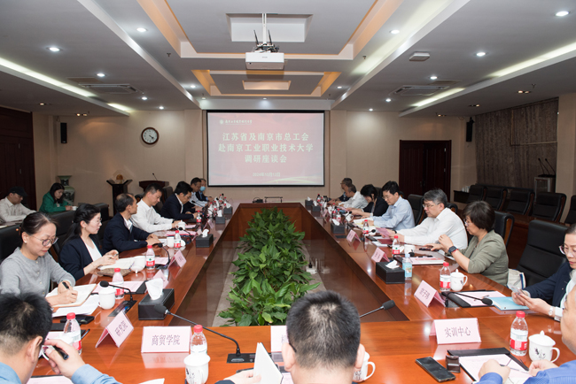 10月12日下午,江苏省总工会党组书记、副主席刘月科,一级巡视员、省教科工会主席寇芳,劳动和经济工作部部长张姿,办公室(研究室)副主任孔涛,南京市总工会党组书记、副主席焦勇,劳动和经济工作部部长宗子玮,科教卫体工会二级调研员方世才等一行七人来校就产教融合及工匠学院建设工作进行调研。我校党委书记、校长谢永华,党委副书记马成荣,党委常委、纪委书记、省监委派驻监察专员邱正祥,党委常委、党委宣传部部长刘畅和相关职能部门、二级学院负责人陪同调研并参加座谈。